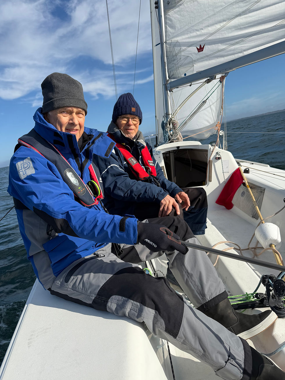 Carsten kunne herefter fortælle at det nu endelig var mulighed for at komme ud at sejle. Isen i havnen var væk. Det blev kun til 2 både med 3 på hver, som sejlede ud i det flotte solrige vejr med en frisk vind fra VNV. Det blev besluttet at vi ville lave MOB øvelser. Vi sejlede nord på hvor der flere gange blev øvet mand over bord. Til sidst foreslog Per E at vi skulle lave en konkurrence mellem de 2 både om hvem der hurtigst kunne samle ”Manden” op. ”Manden” blev smidt i vandet på samme tid fra bådene. Per E måtte se sig slået af Troelses båd som hurtigst fik samlet ”Manden” op -😊. Til sidst blev der øvet lidt havne manøvre inden vi gik i havn efter en super dag på vandet.