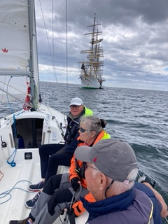Med rigtig god vind fra vest skød vi gevaldig fart ned til skoleskibet, som vi cirkulerede om adskillige gange.