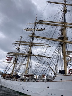 Et imponerende syn - unge matroser øverst i regningen travle med at rulle sejl ondre optaget af andre gøremål. Vi og de vinkede og råbte til hinanden.